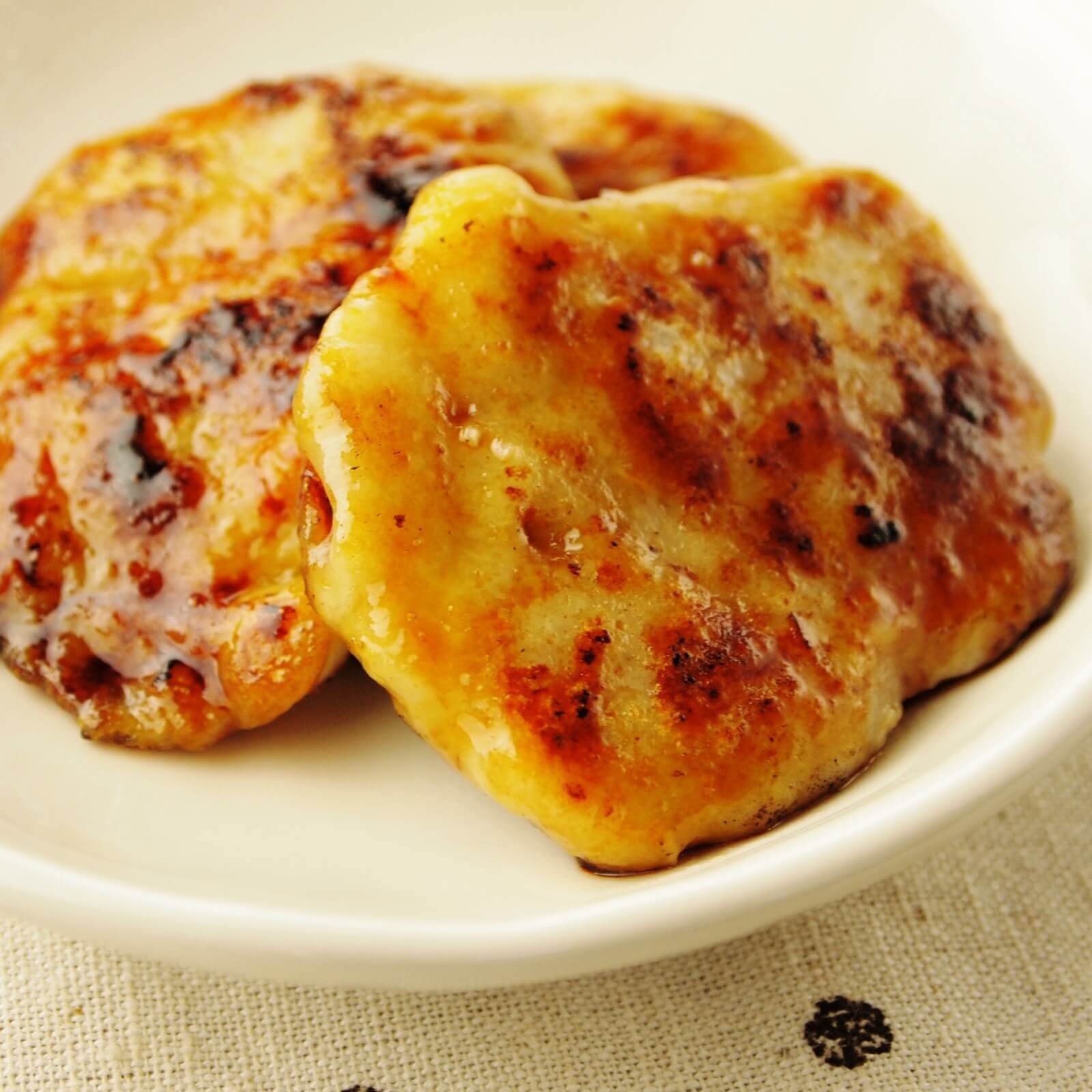 蒸した里芋に片栗粉を混ぜて焼いたお団子です。はちみつと醤油を絡めると、まるでみたらし団子。子どもも大人も大好きな味ですね。デザート感覚でいただけますので、お弁当の隅っこにいかがでしょうか?